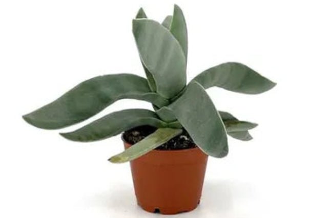 DESCRIPCIÓN VISUAL: Planta suculenta con hojas carnosas, de color verde grisáceo, que crecen en forma de roseta. Las hojas son falcadas, es decir, curvadas como una hoz. Produce pequeñas flores de color rojo o anaranjado.