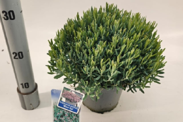 DESCRIPCIÓN VISUAL: Arbusto perenne de pequeño tamaño con hojas estrechas, de color azul plateado y bordes enrollados hacia abajo. Produce flores en forma de campana de color rosa pálido a blanco.