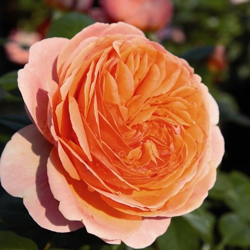 DESCRIPCIÓN VISUAL: Arbusto perenne con tallos espinosos y hojas compuestas de color verde oscuro. Las flores son grandes, dobles, de color naranja a rosa salmón y con un aroma intenso y afrutado.