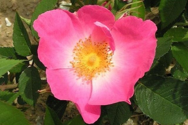 Roser antic de la varietat Gallica presentat en contenidor de 3 litres - Grans flors individuals de color rosa brillant i botó central blanc i rosa difuminat -