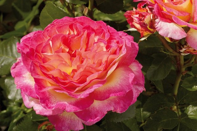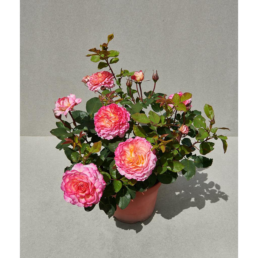 DESCRIPCIÓN VISUAL: Arbusto perenne con tallos espinosos y hojas compuestas, verdes y brillantes. Flores grandes, generalmente de color rosa intenso, con numerosos pétalos y un aroma característico.