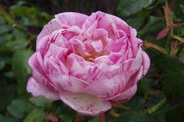 Roser antic borbó presentat en contenidor de 3 litres - Flors dobles grans de color rosa jaspiat d'estries vermelles i porpres - Bell i espectacular -