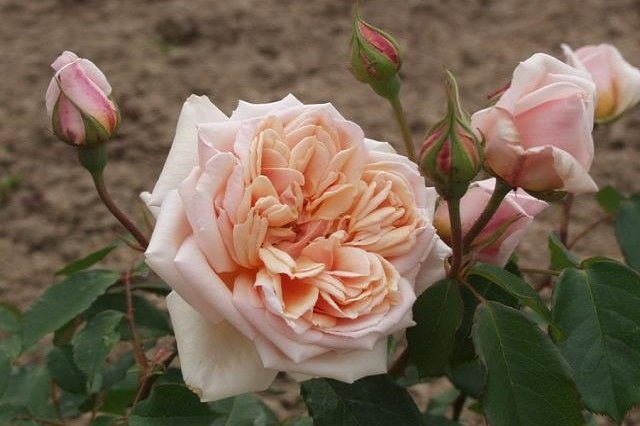 Roser de flors grans de color blanc o groc suau al centre i tons rosats i taronges a les vores i puntes dels pètals. Flors de grans dimensions i dobles. Fullatge verd i brillant. Vigorós. Obtentor: David Austin.