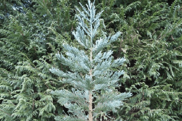 DESCRIPCIÓN VISUAL: Árbol de gran tamaño con una corteza fibrosa de color rojizo-marrón. Las hojas son pequeñas, escamosas y de un tono verde azulado (glaúcas). Su forma es cónica y su tronco es muy grueso y recto.