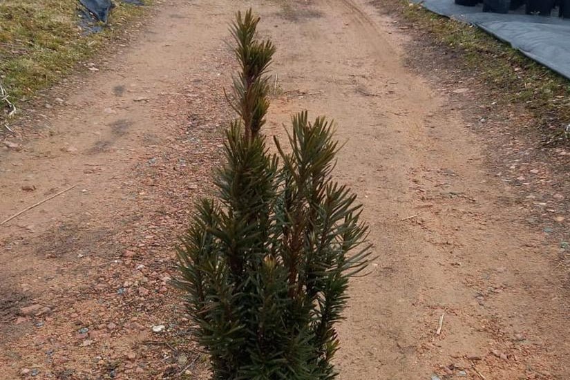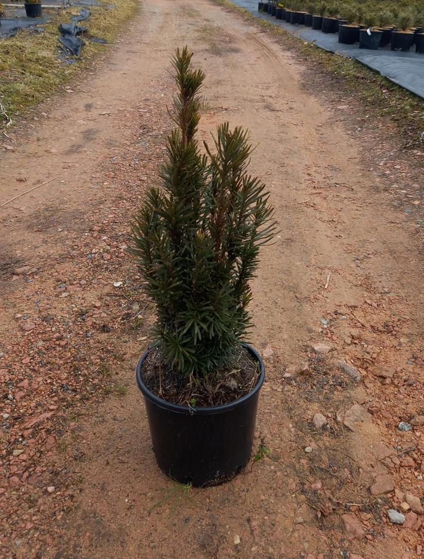 Conífera perenne de porte estrecho, erecto y columnar. Presenta ramas verticales compactas y hojas aciculares planas, alargadas y de color verde oscuro brillante. El crecimiento es lento pero muy uniforme, alcanzando entre 2 y 4 metros de altura con una silueta elegante.