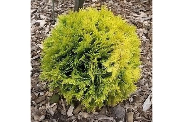 DESCRIPCIÓN VISUAL: Arbusto de forma globosa y compacta con hojas escamiformes de color verde dorado que se vuelven bronce en invierno.