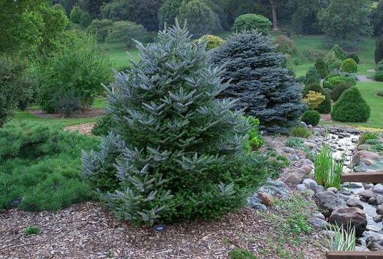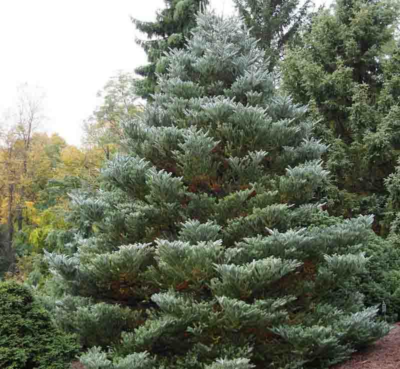 DESCRIPCIÓN VISUAL: Árbol de conífera con hojas (acículas) curvadas hacia arriba mostrando su envés plateado, lo que le da un aspecto brillante y distintivo. Conos de color púrpura a azulados.