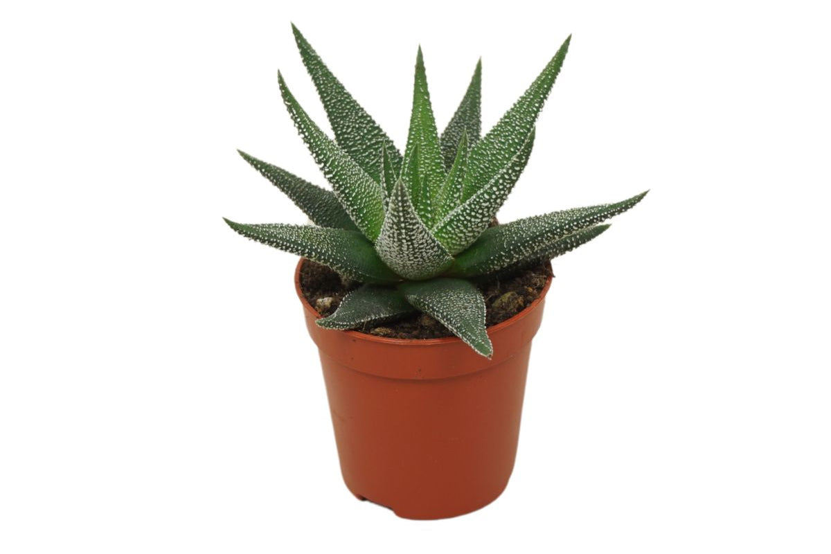 DESCRIPCIÓN VISUAL: Planta suculenta con hojas carnosas, verdes y moteadas con pequeñas protuberancias blancas. Las hojas crecen en forma de roseta y pueden presentar un aspecto ligeramente translúcido.