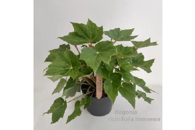 DESCRIPCIÓN VISUAL: La Begonia x ricinifolia 'Immense' es una planta herbácea con grandes hojas carnosas de color verde oscuro y forma acorazonada, con un aspecto similar al de las hojas de ricino. Sus flores pueden ser de color rosa, blanco o rojo, dependiendo de la variedad, y aparecen en racimos.