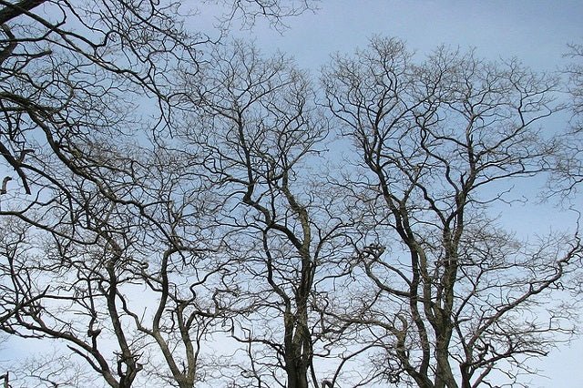 DESCRIPCIÓN VISUAL: Árbol de porte pequeño y retorcido, con ramas tortuosas y tronco irregular. Hojas compuestas de color verde claro y flores blancas colgantes en racimos que aparecen en primavera.