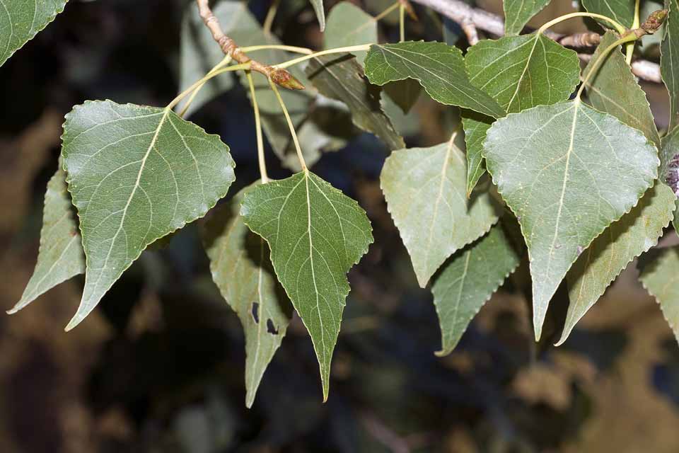 DESCRIPCIÓN VISUAL: Árbol de porte erecto y estrecho, con ramas que crecen casi verticalmente. Hojas de color verde oscuro, triangulares y con bordes serrados. Corteza grisácea y profundamente fisurada en ejemplares adultos.