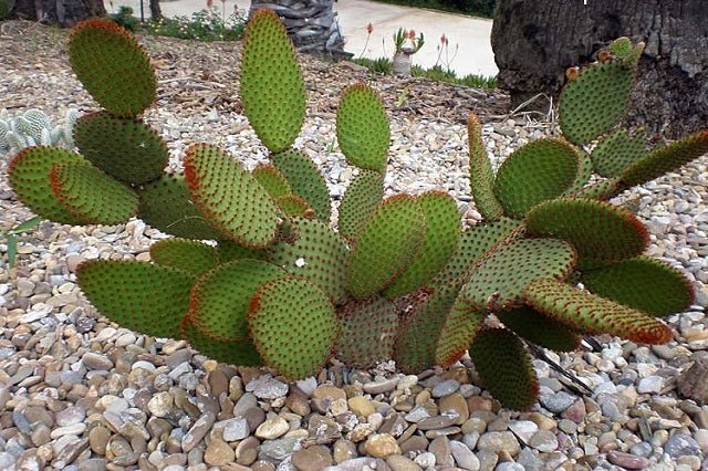 DESCRIPCIÓN VISUAL: Cactus de porte erecto con segmentos aplanados de color verde oscuro y tonos rojizos. Presenta areolas con gloquidios amarillos o rojos que pueden causar irritación al contacto con la piel.