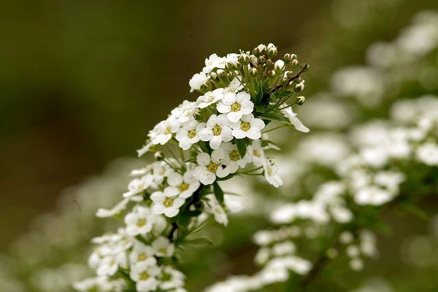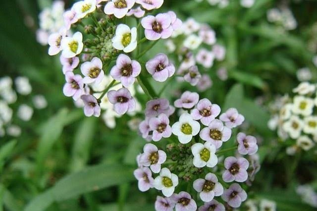 DESCRIPCIÓN VISUAL: Planta herbácea perenne con pequeñas hojas lanceoladas de color verde grisáceo y flores agrupadas en racimos compactos, generalmente de color blanco, aunque pueden ser violetas o rosadas.