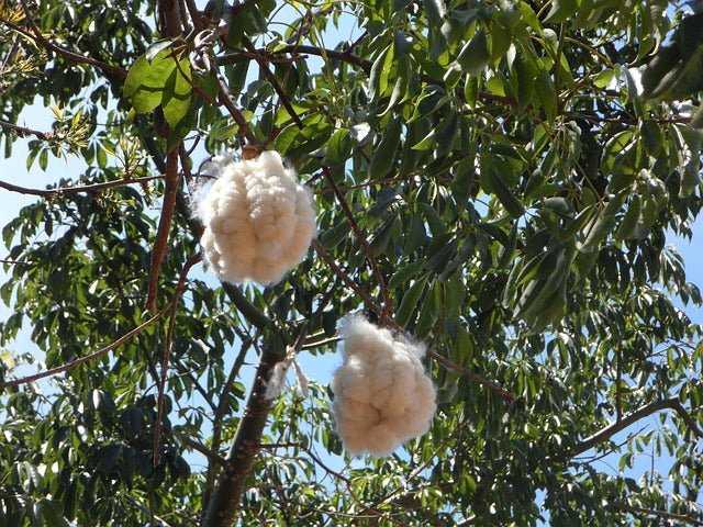 DESCRIPCIÓN VISUAL: Árbol de gran porte con tronco engrosado y espinoso, copa amplia y follaje caducifolio. Flores blancas o amarillentas seguidas de frutos en cápsulas con semillas rodeadas de fibra algodonosa.