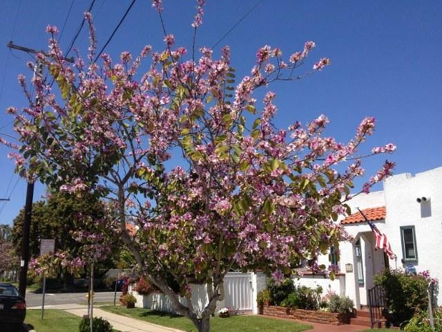 DESCRIPCIÓN VISUAL: Árbol de tamaño medio con hojas en forma de casco o pezuña y flores grandes, generalmente de color rosa, blanco o púrpura, que se asemejan a las orquídeas.