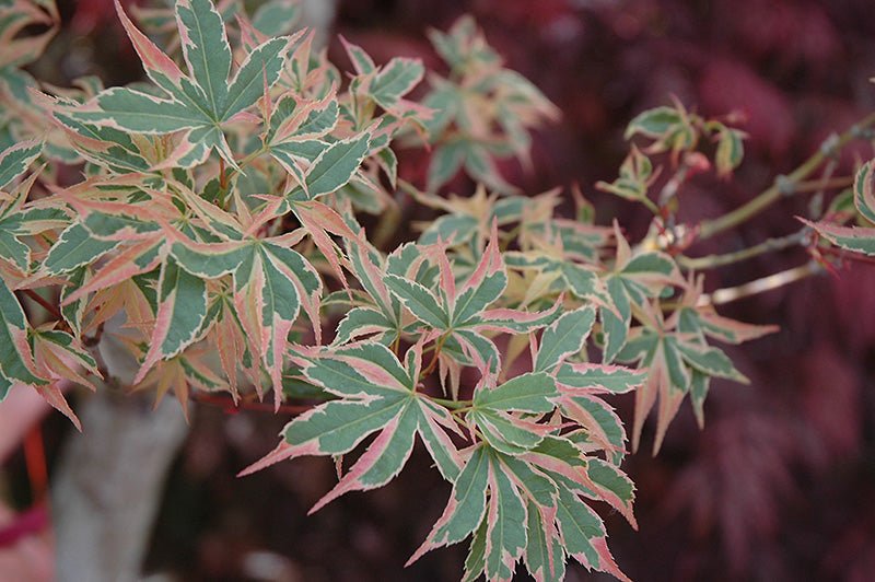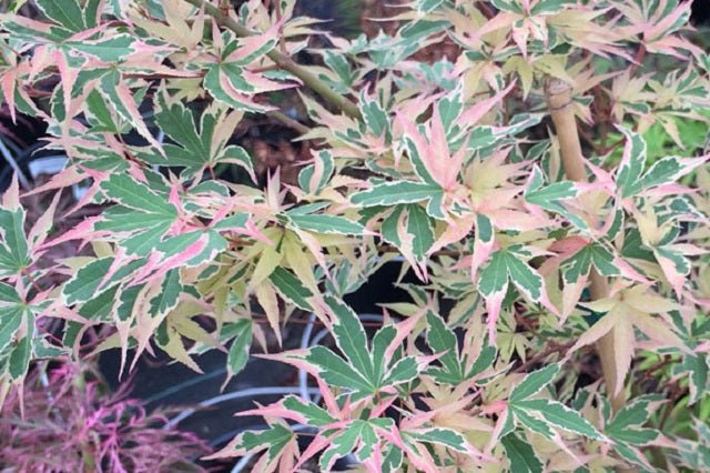 DESCRIPCIÓN VISUAL: Este arce japonés es conocido por sus hojas lobuladas de colores vibrantes que varían desde tonos rosados a verdes con bordes blancos y cremas. En otoño, las hojas adquieren tonalidades rojas y anaranjadas.