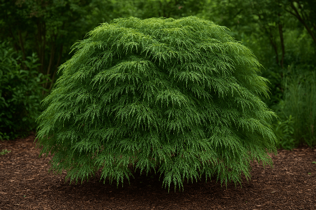 DESCRIPCIÓN VISUAL: Arce japonés caducifolio de porte llorón y estructura elegante, con ramas largas y colgantes que forman una silueta en cascada muy definida. Sus hojas palmadas y finamente lobuladas son de color verde esmeralda intenso en primavera y verano, volviéndose amarillas y anaranjadas en otoño.