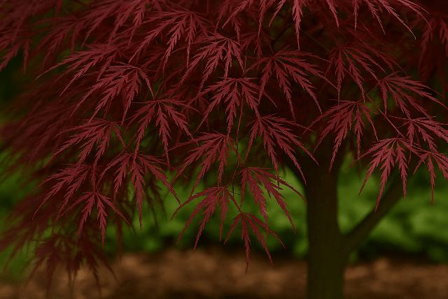 DESCRIPCIÓN VISUAL: Arce japonés caducifolio de porte llorón y elegante, con ramas largas y colgantes que forman una silueta en cascada muy ornamental. Sus hojas palmadas y finamente lobuladas presentan un color rojo rubí intenso en primavera, que se mantiene durante el verano y adquiere matices rojo-anaranjados en otoño, ofreciendo un espectáculo cromático prolongado.