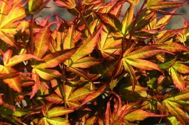 DESCRIPCIÓN VISUAL: Árbol pequeño o arbusto grande con hojas palmadas de color amarillo anaranjado en primavera, verde en verano y tonos rojos o púrpuras en otoño.