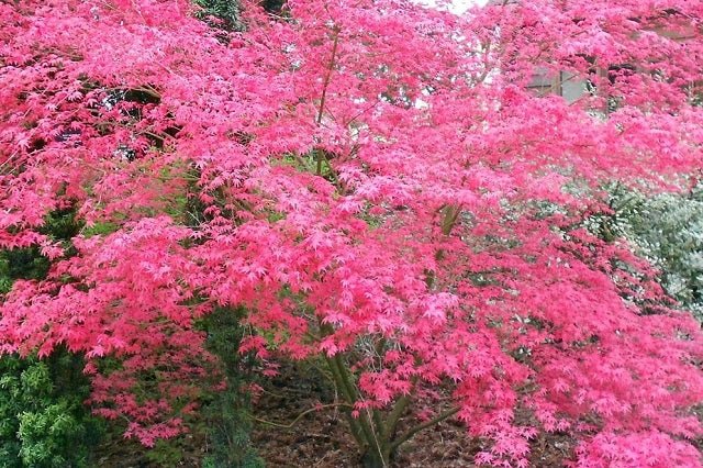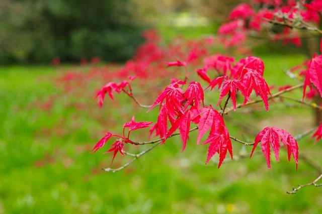 DESCRIPCIÓN VISUAL: Este arce japonés es conocido por sus hojas pequeñas y palmadas de un color rojo brillante en primavera, que se tornan a verde oscuro en verano y luego a rojo carmesí en otoño. Tiene una forma elegante y ramificada, alcanzando una altura de hasta 4-6 metros.