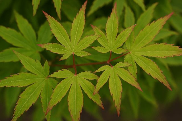 DESCRIPCIÓN VISUAL: Arce japonés caducifolio de porte muy compacto y crecimiento lento, con hojas palmadas pequeñas de color verde brillante que en otoño adquieren tonos amarillos, anaranjados y rojizos muy intensos; forma una copa densa y redondeada de gran valor ornamental.