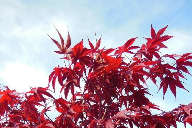 DESCRIPCIÓN VISUAL: Este arce japonés tiene un hábito de crecimiento vertical y compacto. Sus hojas son de un color rojo intenso que se mantiene durante toda la temporada de crecimiento, cambiando a tonos más brillantes de rojo escarlata en otoño.