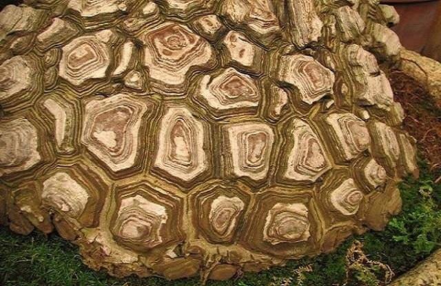 DESCRIPCIÓN VISUAL: Planta trepadora con tubérculos grandes y aplanados que parecen placas. Hojas en forma de corazón y flores pequeñas de color verde.