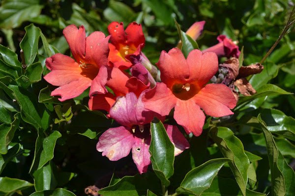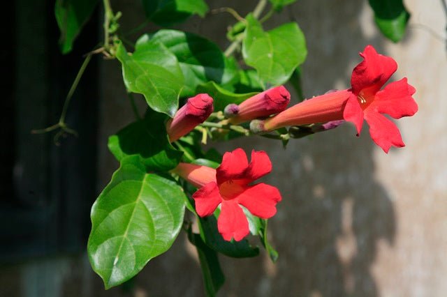 DESCRIPCIÓN VISUAL: Enredadera perenne con flores tubulares de color rojo intenso con garganta amarilla. Hojas compuestas, brillantes y de color verde oscuro.