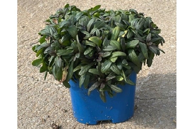 DESCRIPCIÓN VISUAL: Planta perenne de crecimiento bajo y rastrero, con hojas pequeñas, ovaladas y de color marrón oscuro con reflejos bronceados. Produce espigas florales cortas de color violeta intenso que resaltan sobre el follaje. VP