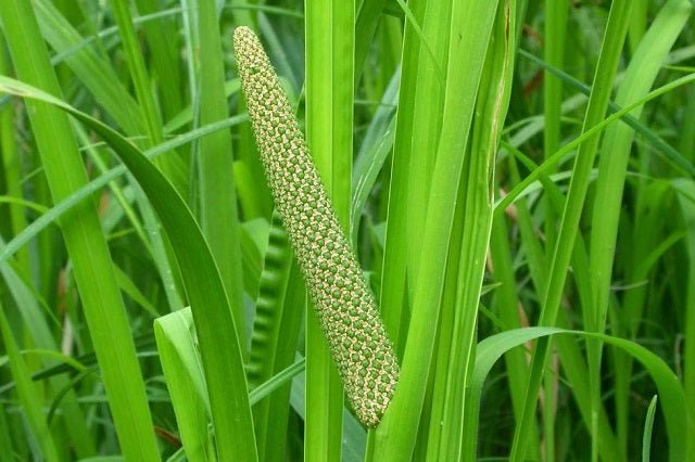 DESCRIPCIÓN VISUAL: Planta herbácea perenne con hojas largas y estrechas de color verde intenso, similares a las del junco. Posee un rizoma horizontal y aromático del cual emergen las hojas y una espiga floral cilíndrica de color verde-amarillento.