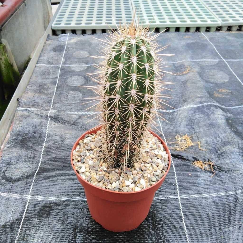 DESCRIPCIÓN VISUAL: Cactus columnar de gran tamaño que puede alcanzar más de 15 metros de altura. Presenta costillas pronunciadas y espinas largas y fuertes. Su color es verde azulado a verde oscuro.