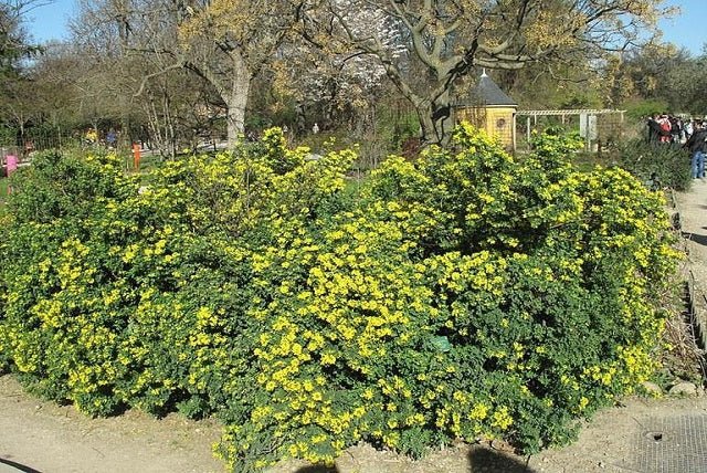 DESCRIPCIÓN VISUAL: Arbusto perenne de porte redondeado y ramas arqueadas, con hojas compuestas de color verde azulado y flores amarillas agrupadas en racimos.