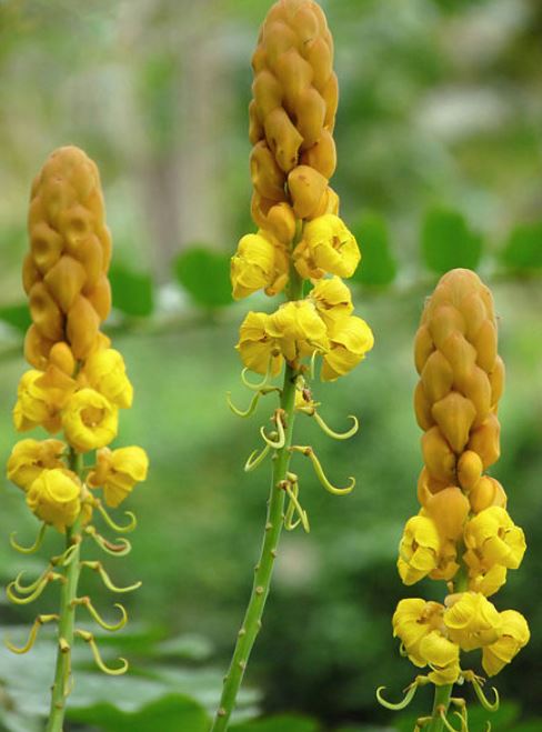 DESCRIPCIÓN VISUAL: Arbusto perenne con hojas pinnadas de color verde oscuro y grandes flores amarillas en forma de racimos verticales que se asemejan a una vela encendida.