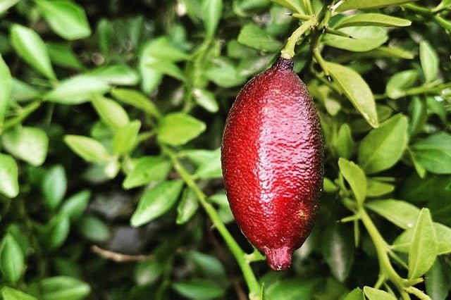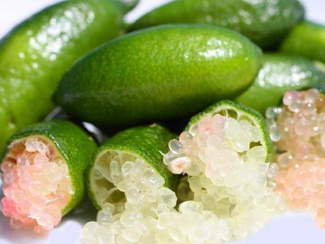 DESCRIPCIÓN VISUAL: El caviar cítrico es un arbusto pequeño con hojas estrechas y alargadas de color verde oscuro. Produce frutos alargados y finos, similares a dedos, que al cortarse revelan pequeñas vesículas jugosas parecidas al caviar, de colores que varían desde el verde al rosa.