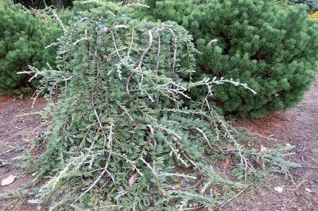 DESCRIPCIÓN VISUAL: Árbol con ramas colgantes y forma llorona. Posee agujas de color verde azulado y una corteza grisácea y fisurada.
