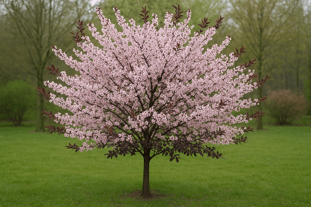 DESCRIPCIÓN VISUAL: Árbol caducifolio de porte mediano con copa redondeada. Sus hojas son de color púrpura oscuro desde el brote hasta otoño, proporcionando un efecto ornamental notable. Produce pequeñas flores rosadas en primavera, seguidas de frutos pequeños comestibles en verano.