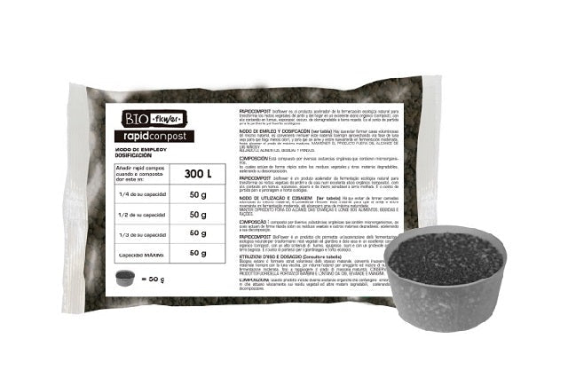 Bolsa de 200g de Rapid Compost: acelerador del compostaje junto con un dosificador.