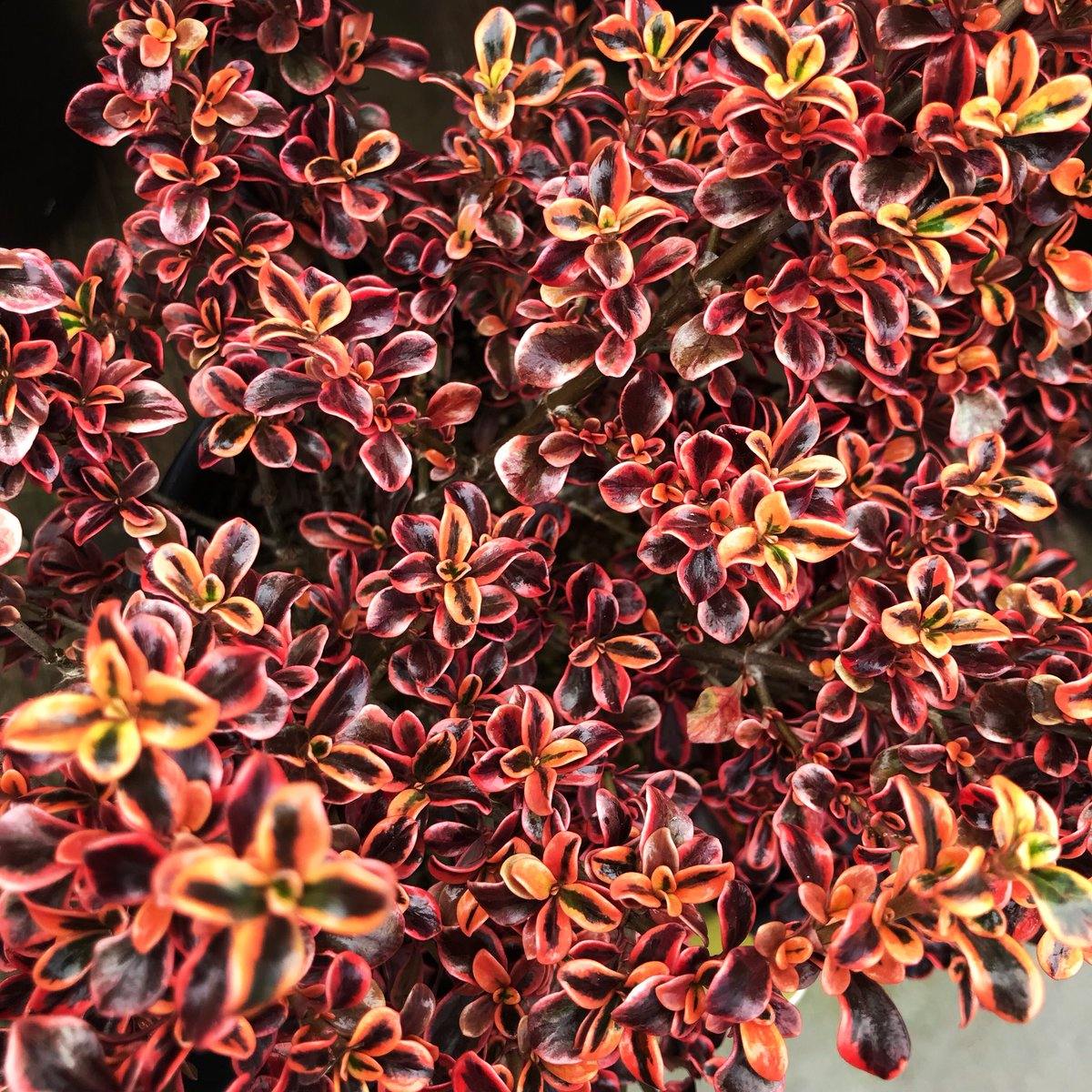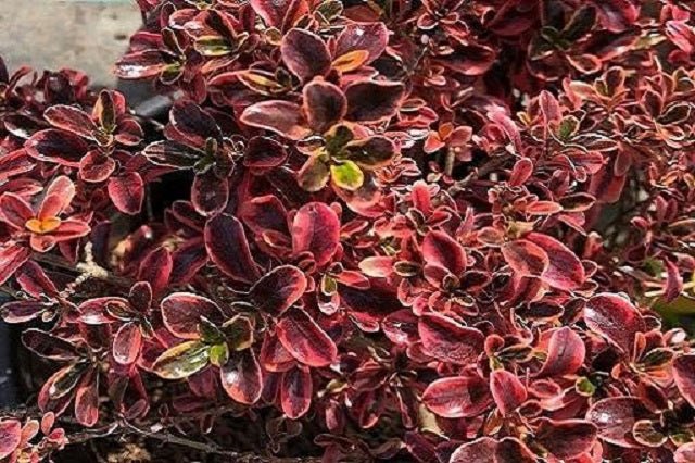DESCRIPCIÓN VISUAL: Arbusto perenne con hojas pequeñas, brillantes y variegadas de colores que van del rosa al verde claro y amarillo, con un brillo casi lacado. La planta puede alcanzar hasta 1 metro de altura y ancho.