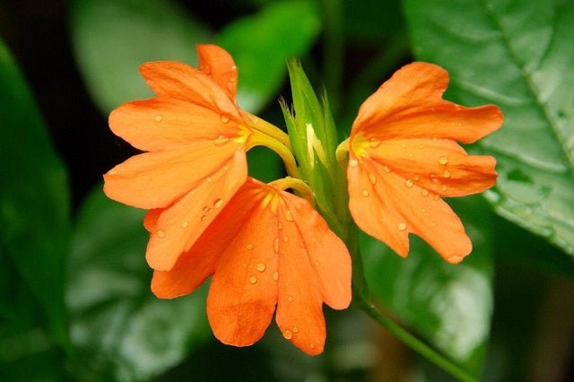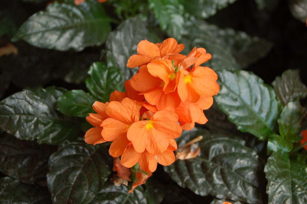 DESCRIPCIÓN VISUAL: La crosandra es una planta herbácea perenne con hojas de color verde oscuro y brillantes. Sus flores son tubulares, de color naranja intenso, y se agrupan en espigas.