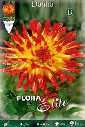 DESCRIPCIÓN VISUAL: La Dalia cactus tiene flores grandes con pétalos largos, estrechos y puntiagudos que se curvan hacia atrás, creando una forma esférica o cónica. Los pétalos son de color amarillo con las puntas rojas, lo que le da un aspecto llamativo y vibrante.