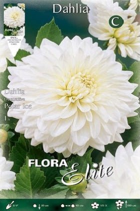 DESCRIPCIÓN VISUAL: La dalia decorativa blanco puro presenta flores grandes y vistosas de pétalos arreglados en un patrón geométrico, con un color blanco intenso que puede variar ligeramente hacia el centro de la flor.