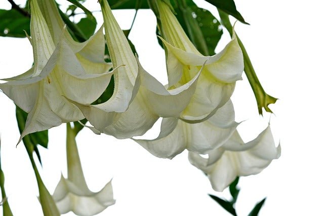 DESCRIPCIÓN VISUAL: Arbusto o pequeño árbol con grandes hojas verdes y flores en forma de trompeta de color blanco puro, colgantes y muy fragantes.