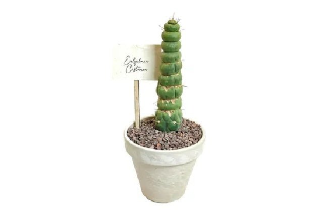 DESCRIPCIÓN VISUAL: Cactus columnar con tallos que crecen en forma de espiral. Presenta espinas de color marrón y flores blancas que aparecen cerca de la parte superior de los tallos.