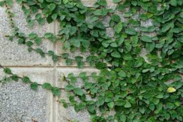 DESCRIPCIÓN VISUAL: Planta trepadora de hojas pequeñas, perennes y de color verde oscuro. Se adhiere a las superficies mediante raíces aéreas.