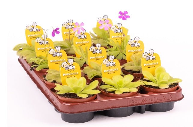 DESCRIPCIÓN VISUAL: Las plantas del género Pinguicula, conocidas comúnmente como Grasas de las violetas, son plantas carnívoras que suelen tener hojas carnosas, de textura pegajosa y de un color verde brillante o a veces rojizo. Las hojas están dispuestas en una roseta basal, son planas y suelen ser alargadas o redondeadas. Estas hojas secretan una sustancia viscosa que sirve para atrapar insectos pequeños. Durante la temporada de floración, produce flores que se alzan en finos tallos sobre la roseta de hojas. Las flores suelen ser pequeñas y delicadas, de colores que varían desde el blanco hasta el púrpura, pasando por el rosa y el azul.