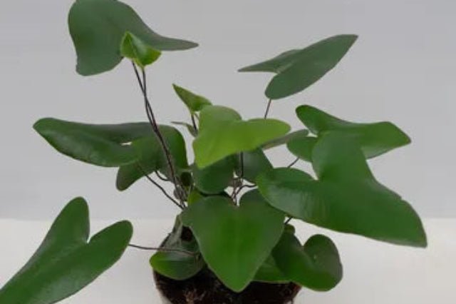 DESCRIPCIÓN VISUAL: Helecho de pequeño tamaño con hojas en forma de corazón de color verde brillante y tallos delgados y flexibles.