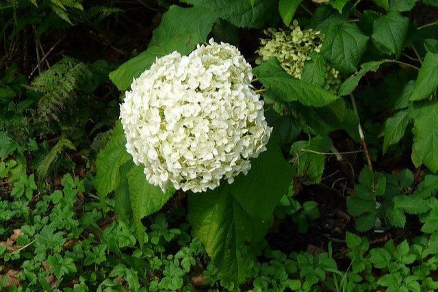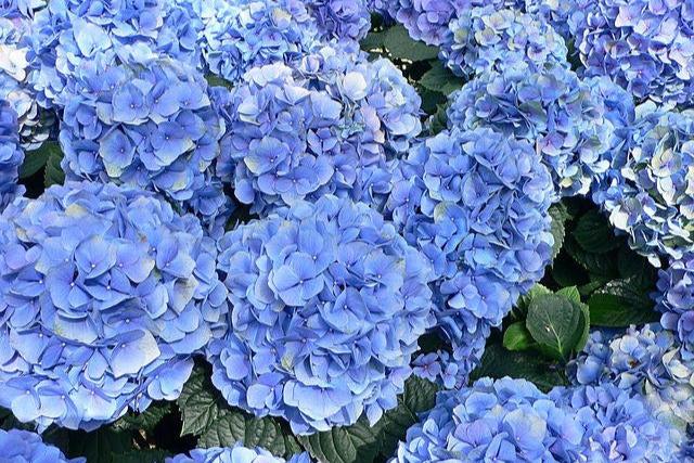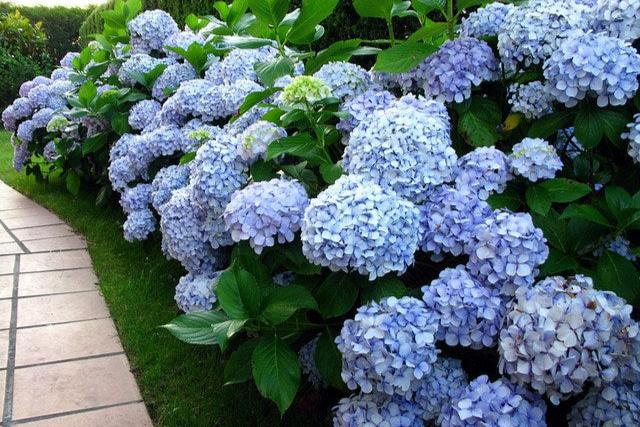 DESCRIPCIÓN VISUAL: Arbusto con grandes hojas verdes y flores agrupadas en inflorescencias globosas o planas, que pueden ser de color azul, rosa, blanco o morado dependiendo de la acidez del suelo.