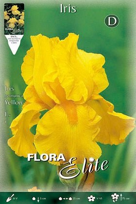 DESCRIPCIÓN VISUAL: Planta con hojas largas y estrechas de color verde grisáceo. Flores grandes y vistosas de color amarillo, con pétalos caídos y otros erguidos, y una barba distintiva en el centro.
