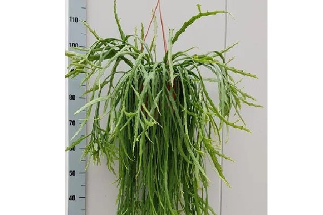 DESCRIPCIÓN VISUAL: Cactus epífito con tallos colgantes, segmentados y aplanados, de color verde claro. Puede presentar flores pequeñas de color blanco o rosado.