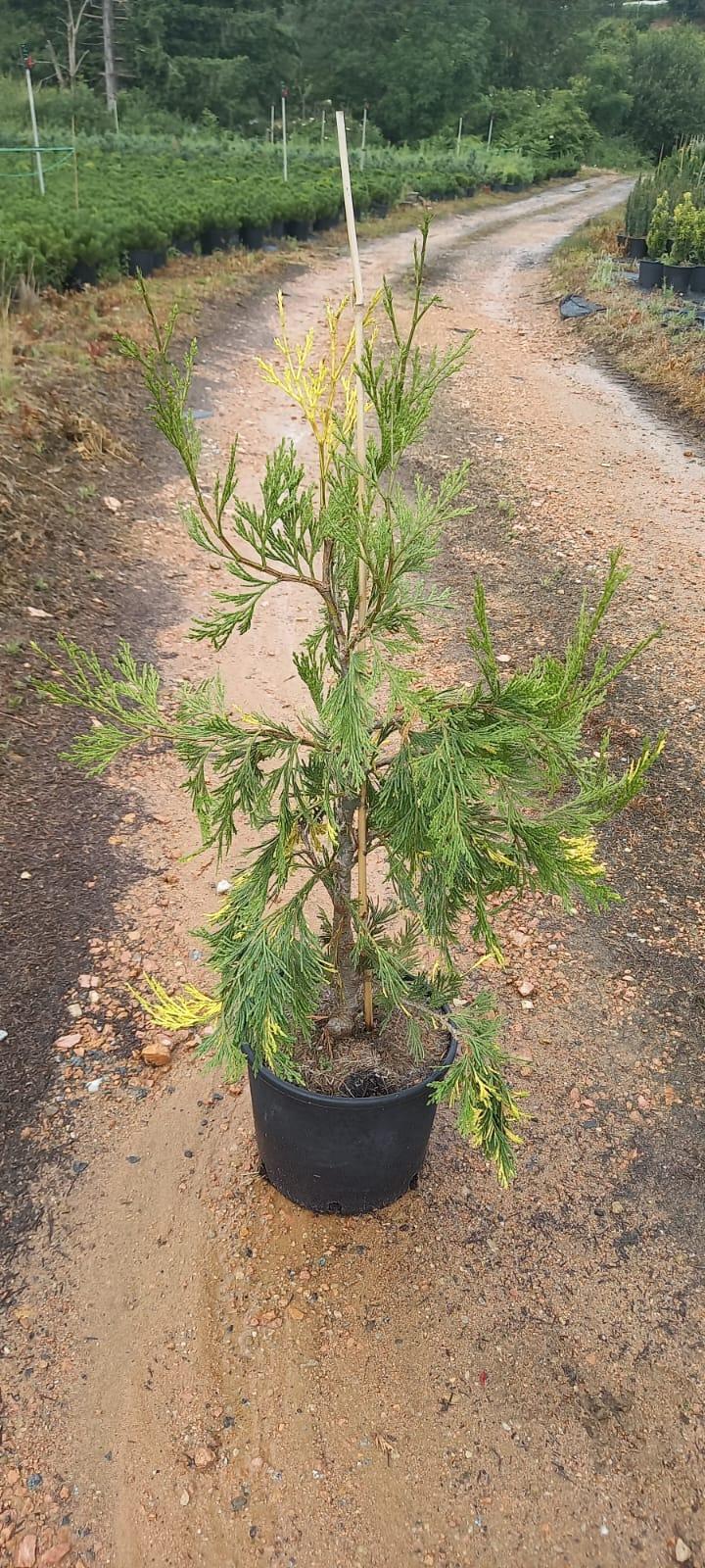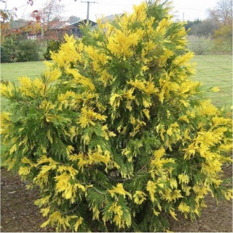 DESCRIPCIÓN VISUAL: Árbol perenne con follaje variegado de color verde y amarillo. Posee una forma cónica y puede alcanzar alturas considerables. Las hojas son escamosas y las ramas tienden a ser densas.
